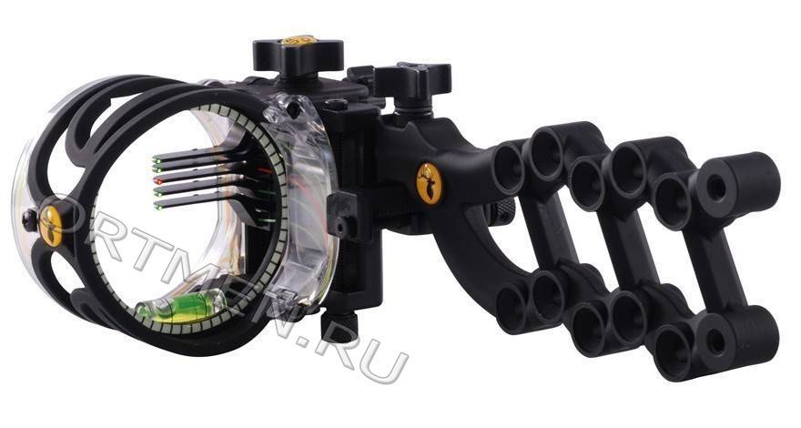 Дистанции размечены заранее с 20 до 60 с шагом в 10 ярдов. Для настройки вы сначала двигаете весь прицел так, чтобы при стрельбе с 20 ярдов верхний пин совпадал с центром мишени. Как только стрелы начали ложиться туда, куда задумано с 20 ярдов, отходите на 10 ярдов назад — начинаете пристрелку второго пина. Расположение второго и последующих пинов регулируется специальной ручкой, то есть теперь таскать набор дюймовых шестигранников для настройки не требуется. Как только на 30 ярдах место скопления ваших стрел в мишени совпало со вторым пином, вас можно поздравить — настройка окончена! Все расстояния: 40, 50 и 60 ярдов прицел, можно сказать, выставил сам. На всякий случай снизу есть маленькая ручка для микронастройки как на «Micro Alpha V5».